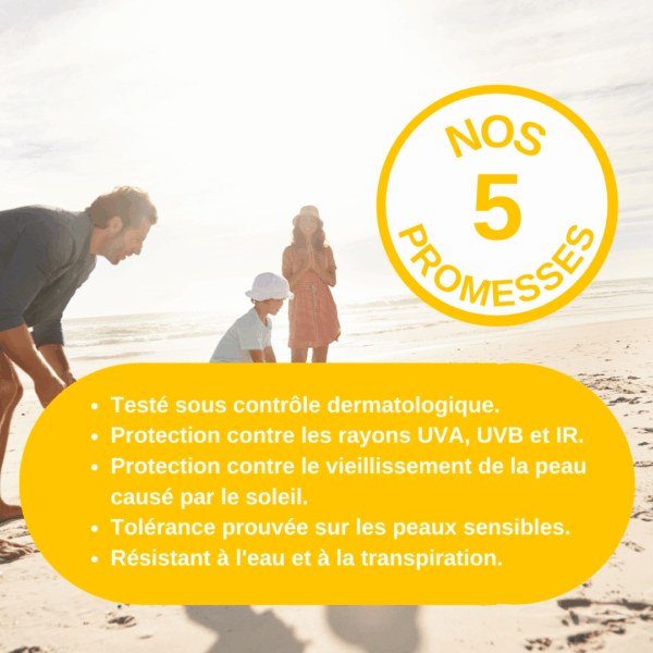 Sa formule sans parfum, sans parabène et résistante à l’eau est adaptée aux peaux sensibles, même sujettes aux allergies solaires. Ce lait léger et facile à appliquer ne colle pas, ne laisse pas de traces blanches, et protège durablement, même pendant les jeux dans l’eau ou à la plage.