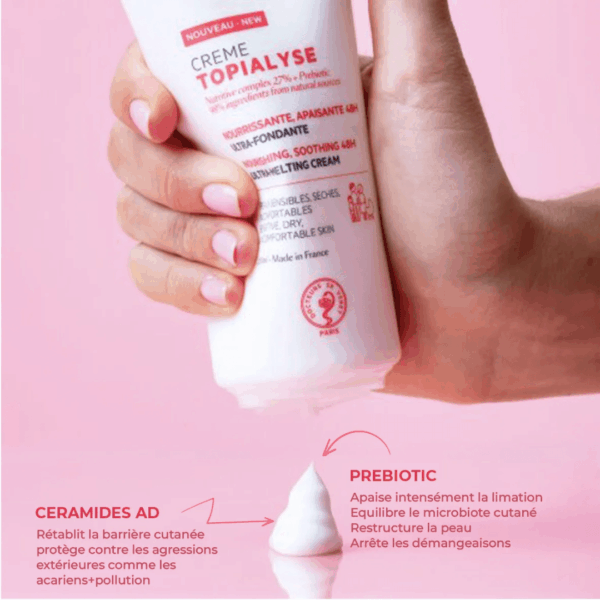 Testée sous contrôle dermatologique, Topialyse Crème est sans parfum, sans paraben et sans allergène majeur, garantissant une tolérance optimale.